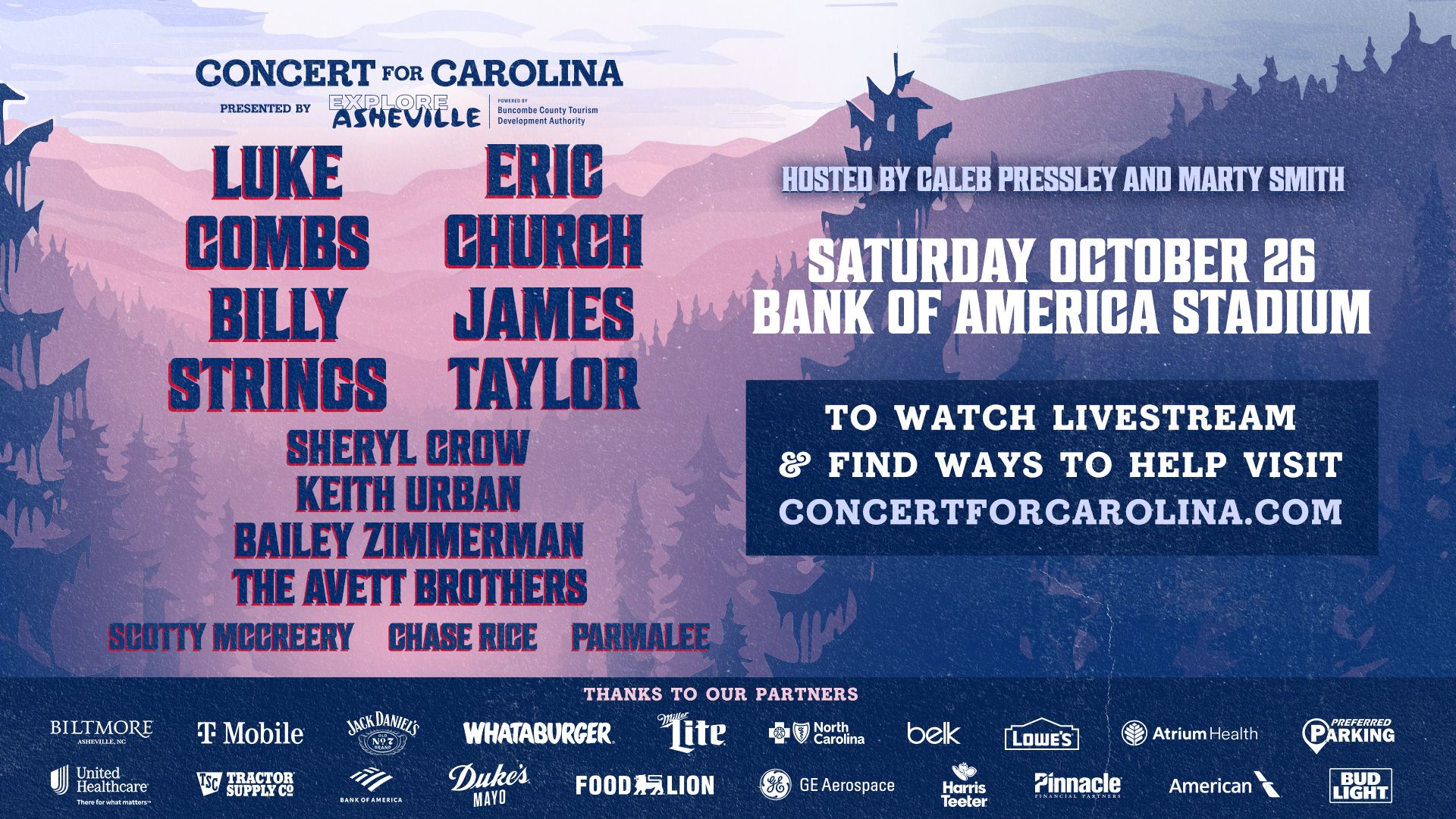 “Concert for Carolina” is made possible due to the support and generosity of David and Nicole Tepper and Tepper Sports & Entertainment, Explore Asheville, Biltmore Estate, T-Mobile, Jack Daniel’s, Whataburger, Miller Lite, Blue Cross and Blue Shield of North Carolina, Belk, Lowe’s, Atrium Health, Tractor Supply Company, Bank of America, American Airlines, Food Lion, Duke’s Mayo, GE Aerospace, Harris Teeter, Pinnacle Financial Partners, United Healthcare, Bud Light, Preferred Parking and Gildan.