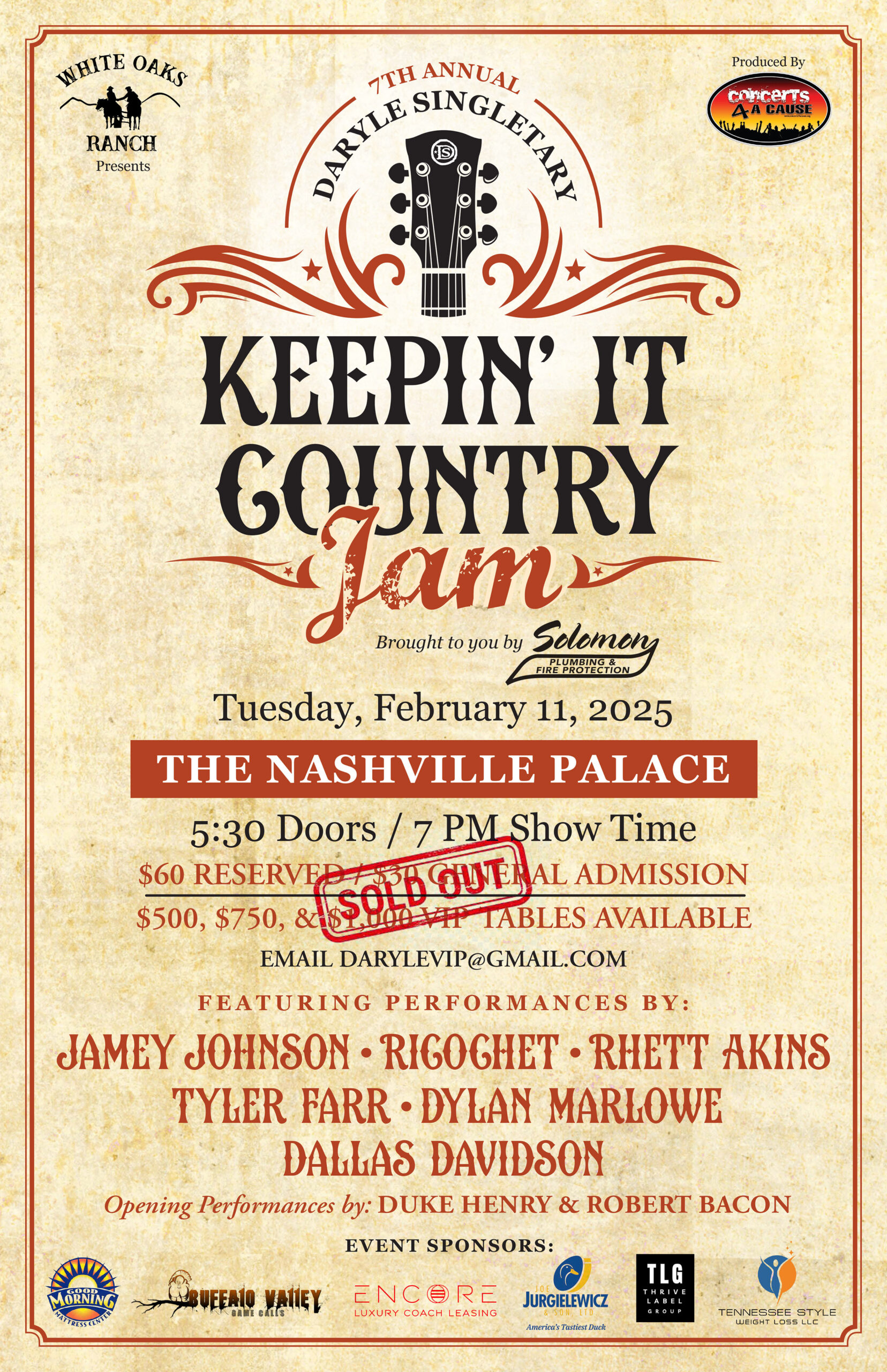 NASHVILLE, Tenn. – It’s official, the 7th annual Daryle Singletary “Keepin’ It Country Jam” has SOLD OUT as announced by Josh Bleidt, producer of the annual event. The benefit concert is taking place at The Nashville Palace on Tuesday, February 11, 2025, and will be headlined by Jamey Johnson. Additional performers include: Ricochet, Rhett Akins, Tyler Farr, Dylan Marlowe & Dallas Davidson.